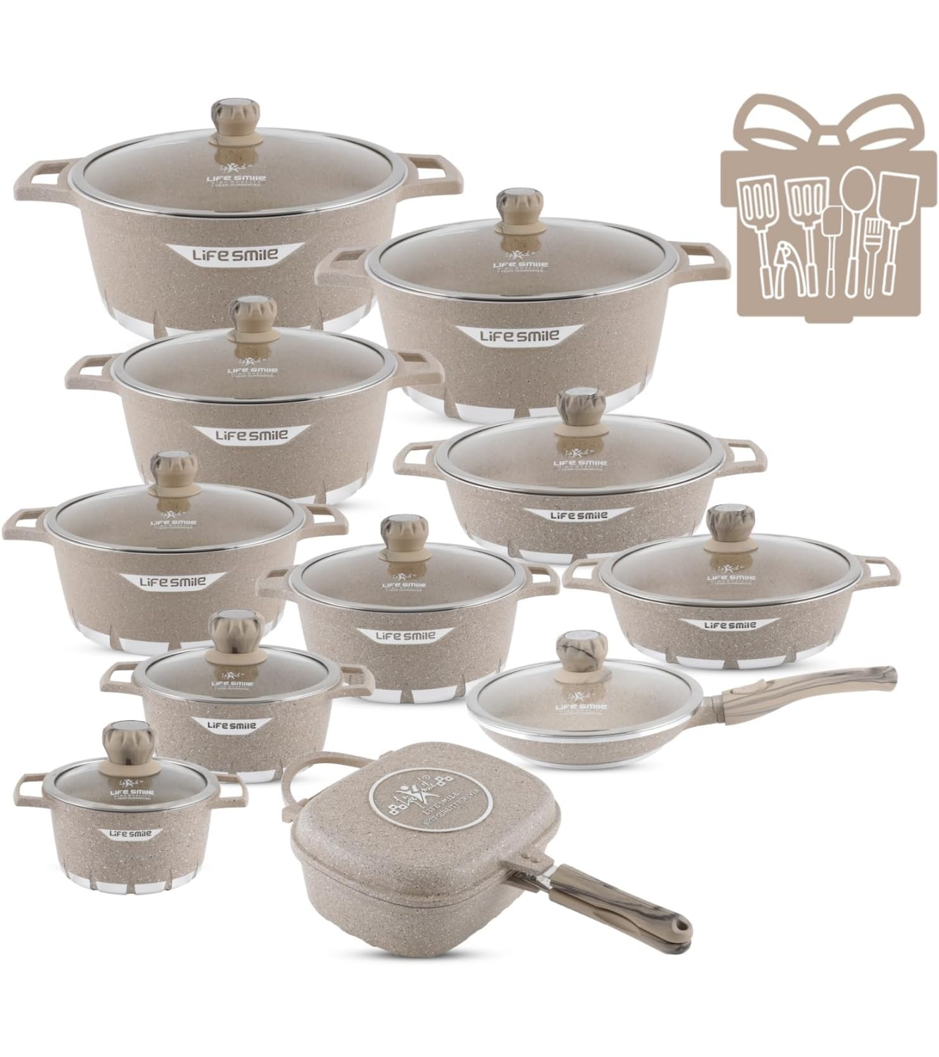 LIFE SMILE Conjunto de Panelas Granito Stone - 29 Peças, Revestimento Antiaderente Multi Camadas, 100% Livre de PFOA, Compatível com Todos os Fogões